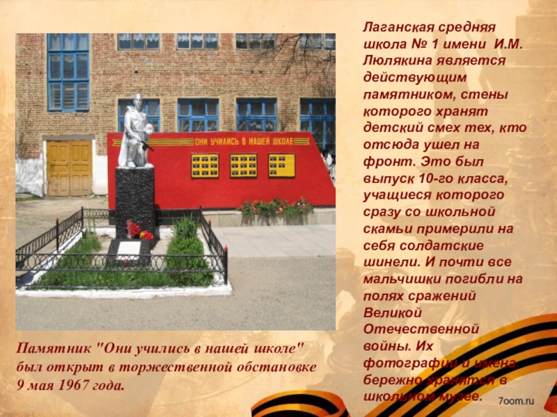 Памятник "Они учились в нашей школе" был открыт в торжественной обстановке 9 мая 1967 года.