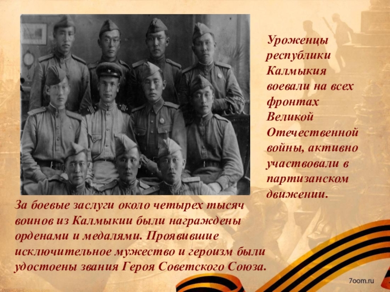 За боевые заслуги около четырех тысяч воинов из Калмыкии были награждены орденами и медалями. Проявившие исключительное мужество и героизм были удостоены звания Героя Советского Союза.