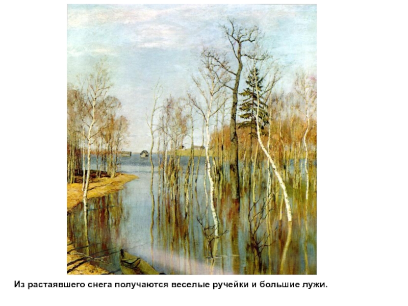 Слайд 4Из растаявшего снега получаются веселые ручейки и большие лужи.