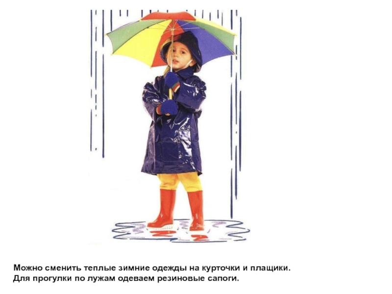 Слайд 11Можно сменить теплые зимние одежды на курточки и плащики. Для прогулки
