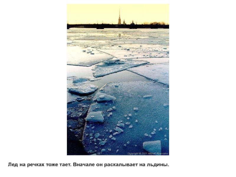 Слайд 5Лед на речках тоже тает. Вначале он раскалывает на льдины.