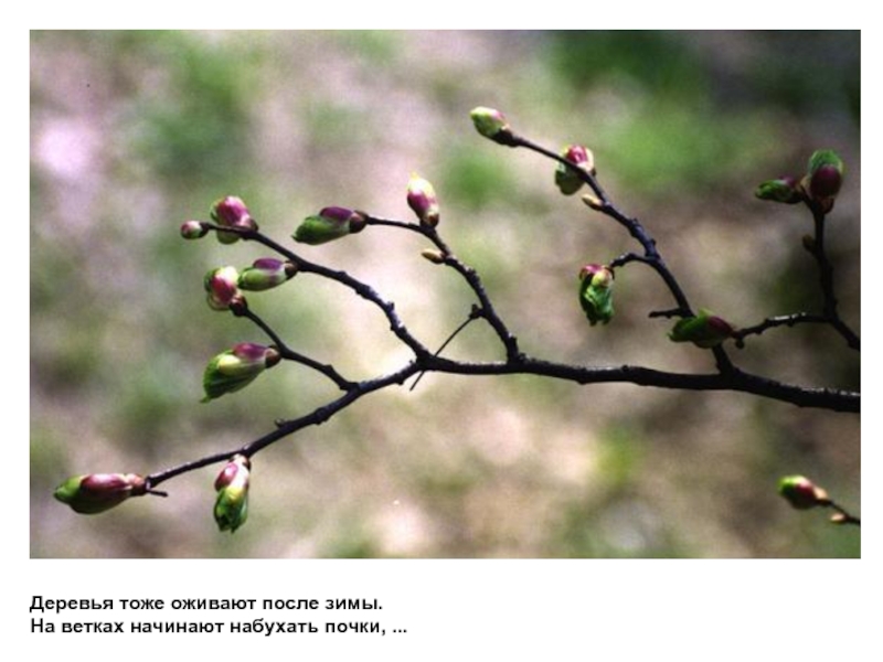 Деревья тоже оживают после зимы. На ветках начинают набухать почки, ...