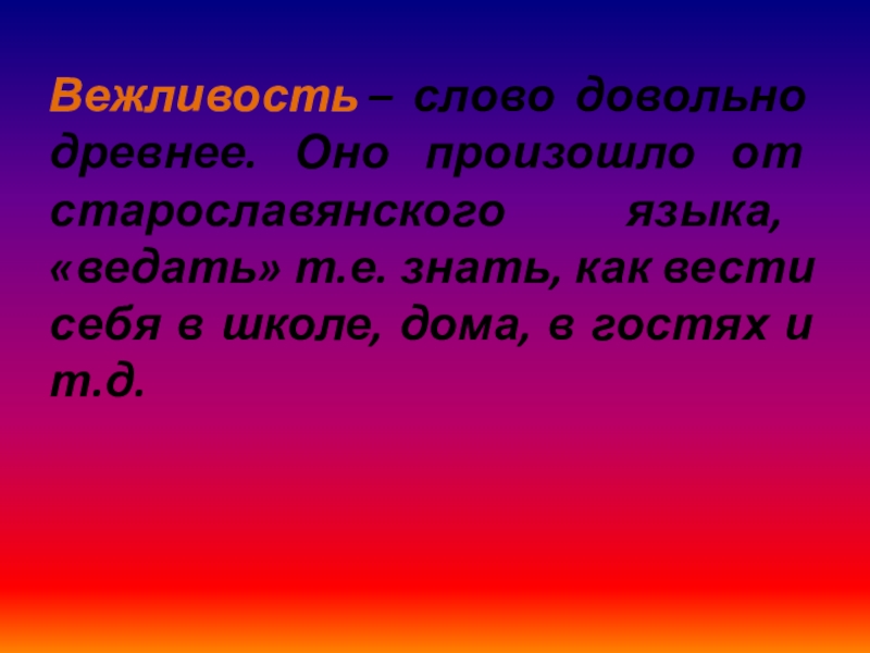 Вежливость – слово довольно древнее. Оно произошло от старославянского языка, «ведать» т.е. знать, как вести себя в школе,