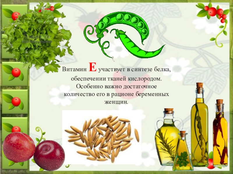 Витамин Е участвует в синтезе белка, обеспечении тканей кислородом. Особенно важно достаточное количество его в рационе беременных