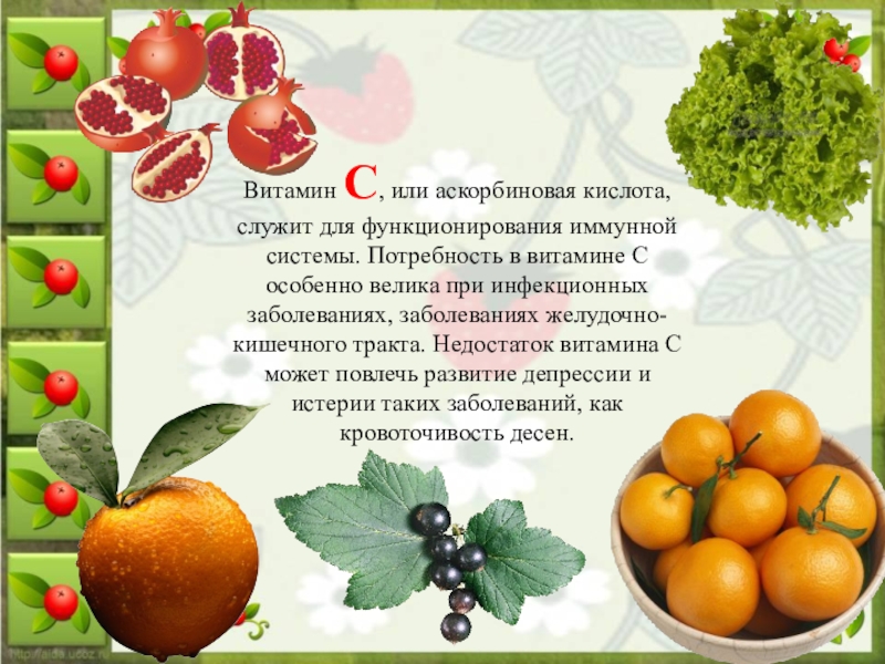 в витамине С особенно велика при инфекционных заболеваниях, заболеваниях желудочно-кишечного тракта. Недостаток витамина С может повлечь развитие депрессии и истерии таких заболеваний, как кровоточивость десен.