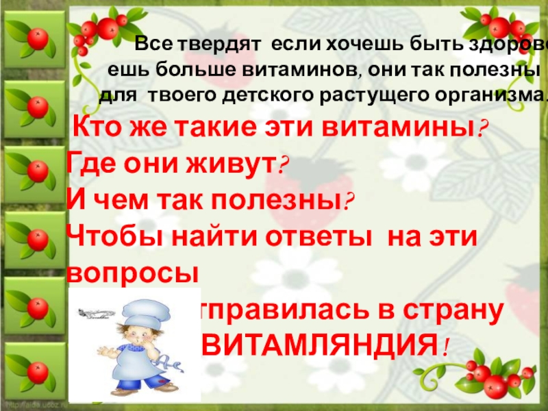 Все твердят если хочешь быть здоровой ешь больше витаминов, они так полезны для твоего детского растущего организма. Кто же такие эти витамины? Где они живут? И чем так полезны?Чтобы найти
