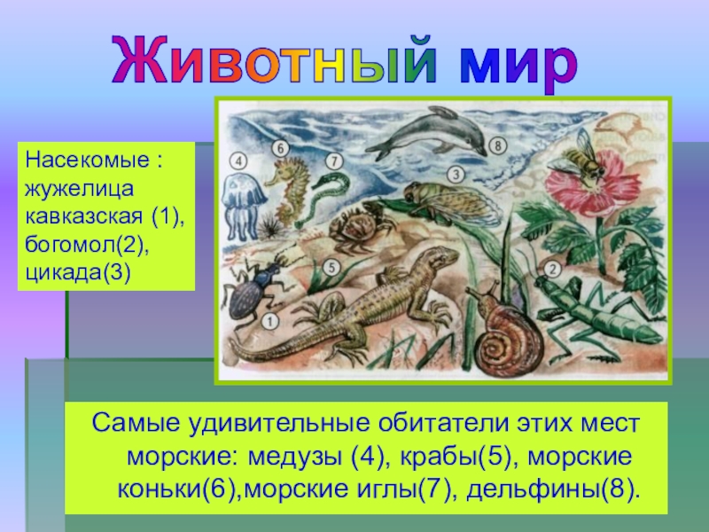 Насекомые : жужелица кавказская (1), богомол(2), цикада(3)