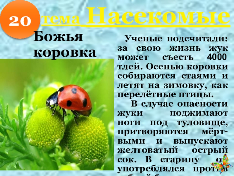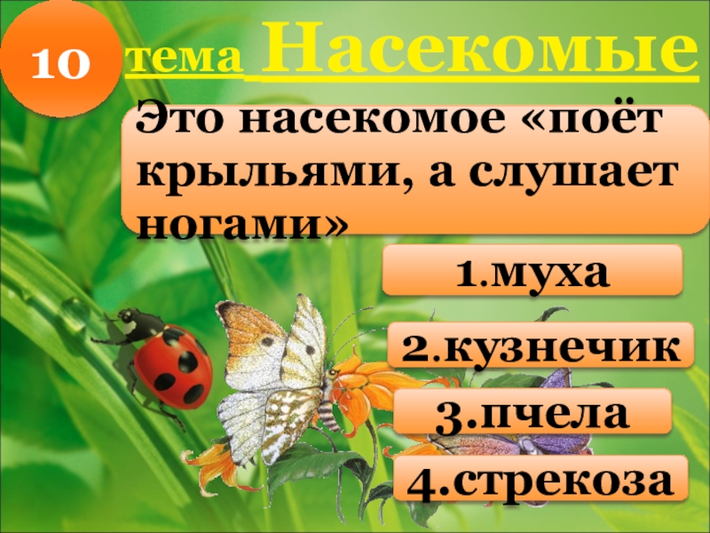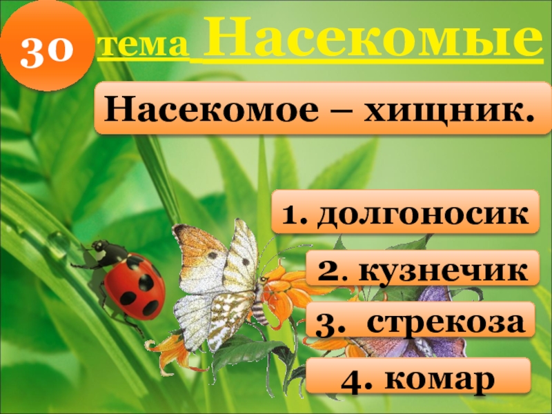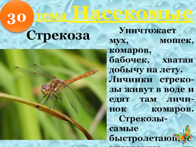 Личинки стреко-зы живут в воде и едят там личи-нок комаров. Стрекозы-самые быстролетающие насекомые, их скорость достига-ет 57 км/ч.