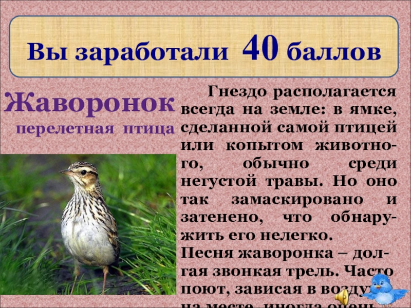 Песня жаворонка – дол-гая звонкая трель. Часто поют, зависая в воздухе на месте, иногда очень высоко.