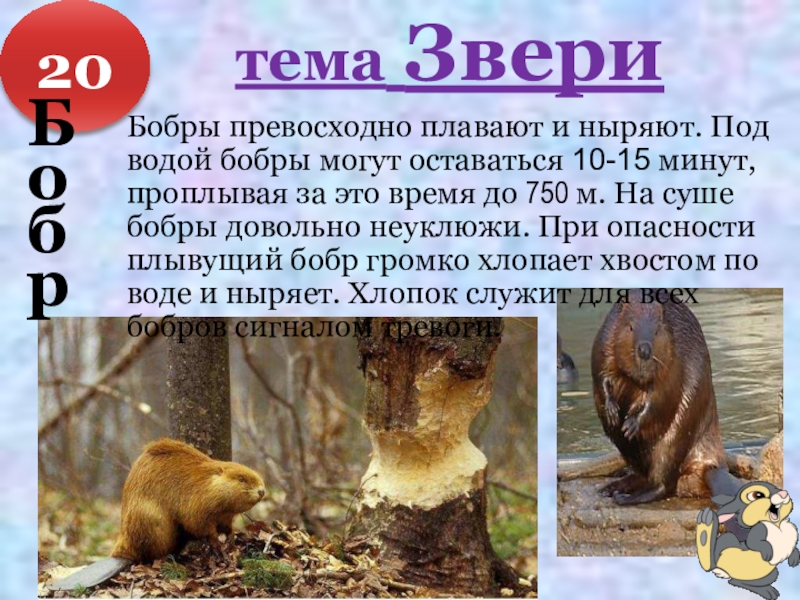оставаться 10-15 минут, проплывая за это время до 750 м. На суше бобры довольно неуклюжи. При опасности плывущий бобр громко хлопает хвостом по воде и ныряет. Хлопок служит для всех бобров сигналом тревоги.
