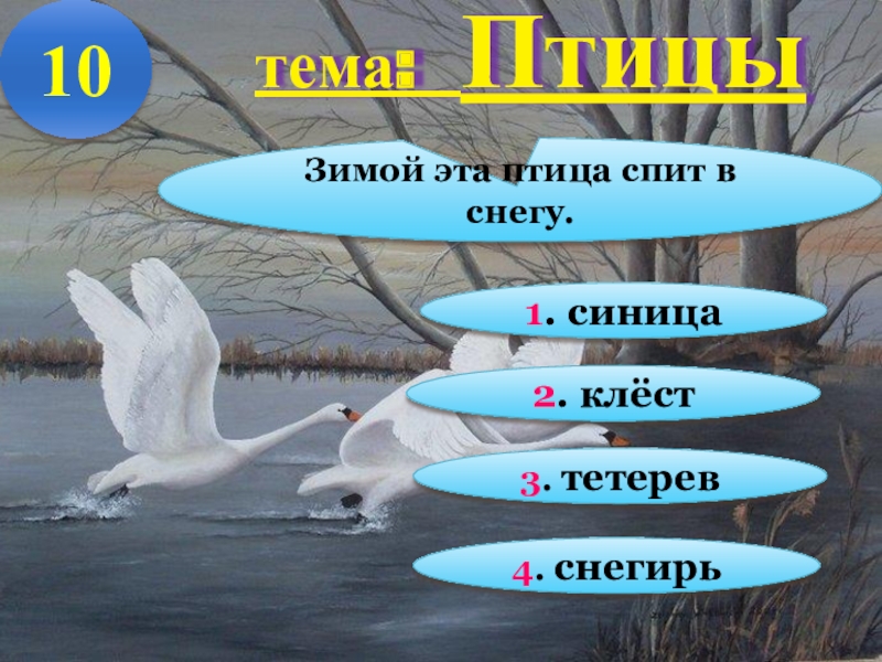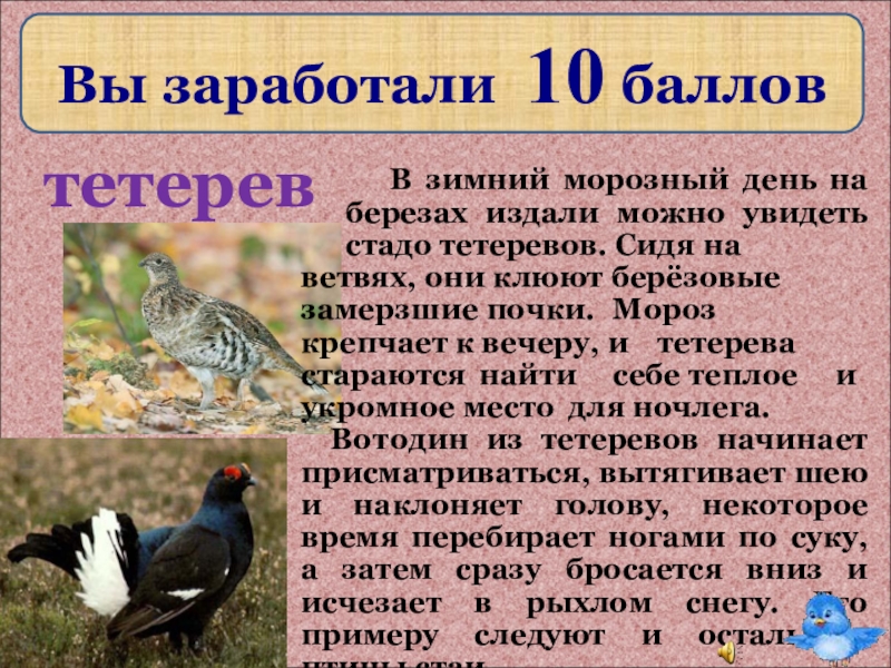 день на березах издали можно увидеть стадо тетеревов. Сидя на ветвях, они клюют берёзовые замерзшие почки. Мороз крепчает к вечеру, и тетеревa стараются найти себе теплое и укромное место для ночлега.