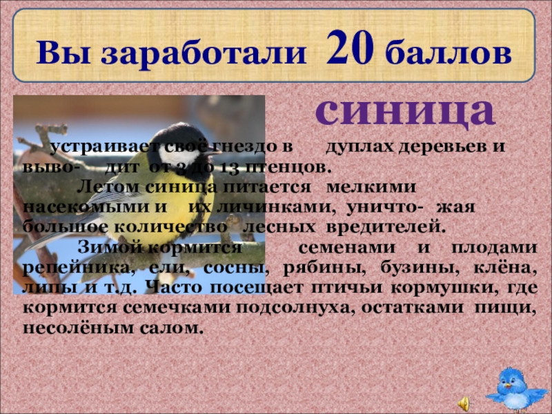 Летом синица питается мелкими насекомыми и их личинками, уничто- жая большое количество лесных вредителей.