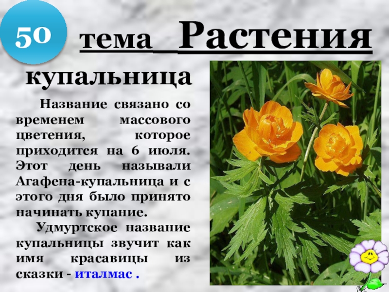 Удмуртское название купальницы звучит как имя красавицы из сказки - италмас .