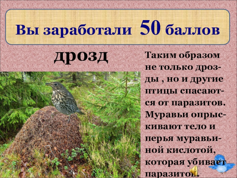 другие птицы спасают-ся от паразитов. Муравьи опрыс-кивают тело и перья муравьи-ной кислотой, которая убивает паразитов.