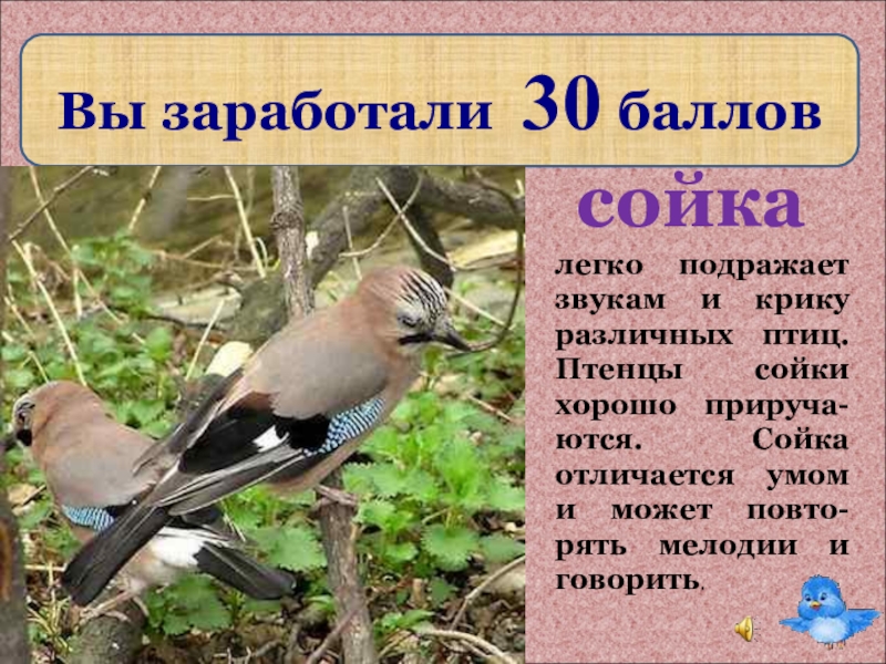 сойки хорошо прируча-ются. Сойка отличается умом и может повто-рять мелодии и говорить.