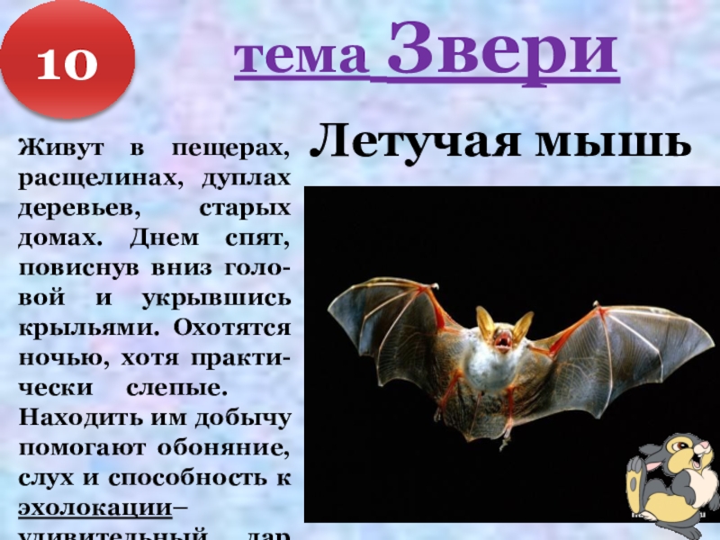Днем спят, повиснув вниз голо-вой и укрывшись крыльями. Охотятся ночью, хотя практи-чески слепые. Находить им добычу помогают обоняние, слух и способность к эхолокации– удивительный дар природы.