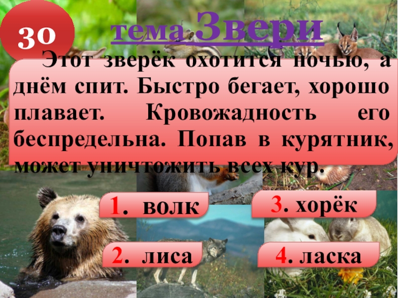 а днём спит. Быстро бегает, хорошо плавает. Кровожадность его беспредельна. Попав в курятник, может уничтожить всех кур.