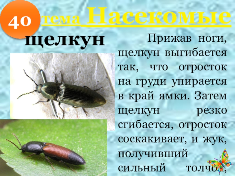 отросток на груди упирается в край ямки. Затем щелкун резко сгибается, отросток соскакивает, и жук, получивший сильный толчок, подпрыгивает.