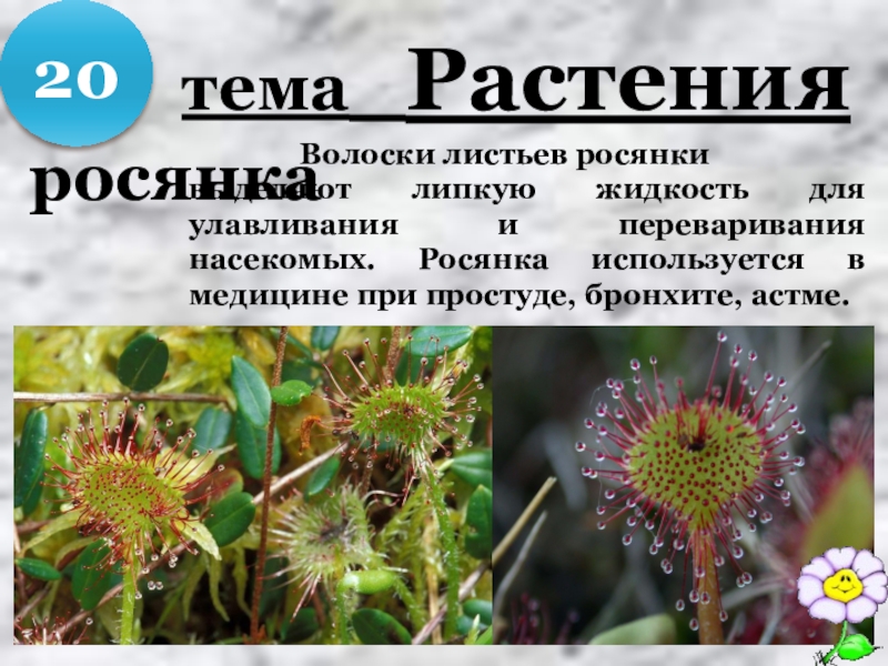 улавливания и переваривания насекомых. Росянка используется в медицине при простуде, бронхите, астме.