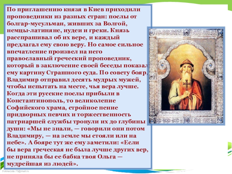 от болгар-мусульман, живших за Волгой, немцы-латиняне, иудеи и греки. Князь расспрашивал об их вере, и каждый предлагал ему свою веру. Но самое сильное впечатление произвел на него православный греческий проповедник, который в заключение своей беседы показал ему картину Страшного суда. По совету бояр, Владимир отправил десять мудрых мужей, чтобы испытать на месте, чья вера лучше. Когда эти русские послы прибыли в Константинополь, то великолепие Софийского храма, стройное пение придворных певчих и торжественность патриаршей службы тронули их до глубины души: «Мы не знали, — говорили они потом Владимиру, — на земле мы стояли или на небе». А бояре тут же ему заметили: «Если бы вера греческая не была лучше других вер, не приняла бы ее бабка твоя Ольга — мудрейшая из людей».