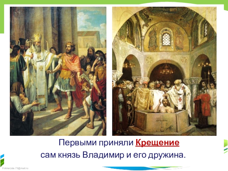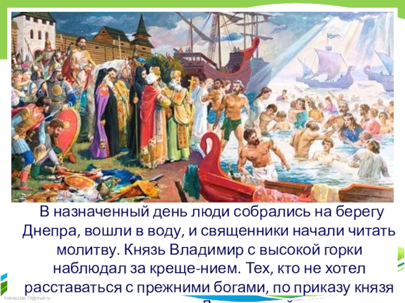 и священники начали читать молитву. Князь Владимир с высокой горки наблюдал за креще-нием. Тех, кто не хотел расставаться с прежними богами, по приказу князя загоняли в Днепр силой.