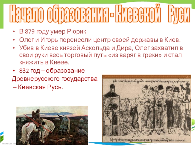 Убив в Киеве князей Аскольда и Дира, Олег захватил в свои руки весь торговый путь «из варяг в греки» и стал княжить в Киеве.