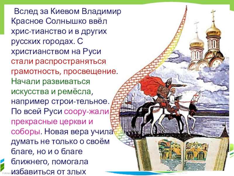 русских городах. С христианством на Руси стали распространяться грамотность, просвещение. Начали развиваться искусства и ремёсла, например строи-тельное. По всей Руси соору-жали прекрасные церкви и соборы. Новая вера учила думать не только о своём благе, но и о благе ближнего, помогала избавиться от злых помыслов, сплачивала и объединяла людей.