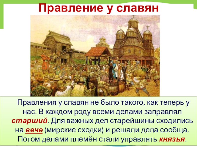 нас. В каждом роду всеми делами заправлял старший. Для важных дел старейшины сходились на вече (мирские сходки) и решали дела сообща. Потом делами племён стали управлять князья.