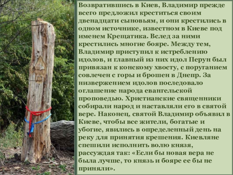 и они крестились в одном источнике, известном в Киеве под именем Крещатика. Вслед за ними крестились многие бояре. Между тем, Владимир приступил к истреблению идолов, и главный из них идол Перун был привязан к конскому хвосту, с поруганием совлечен с горы и брошен в Днепр. За низвержением идолов последовало оглашение народа евангельской проповедью. Христианские священники собирали народ и наставляли его в святой вере. Наконец, святой Владимир объявил в Киеве, чтобы все жители, богатые и убогие, явились в определенный день на реку для принятия крешения. Киевляне спешили исполнить волю князя, рассуждая так: «Если бы новая вера не была лучше, то князь и бояре ее бы не приняли».
