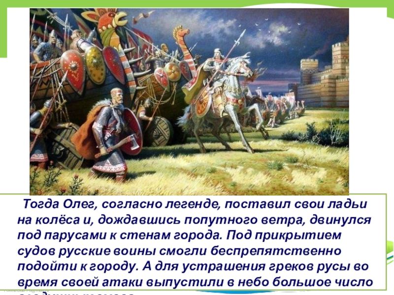 Слайд 32 Тогда Олег, согласно легенде, поставил свои ладьи на колёса и, дождавшись