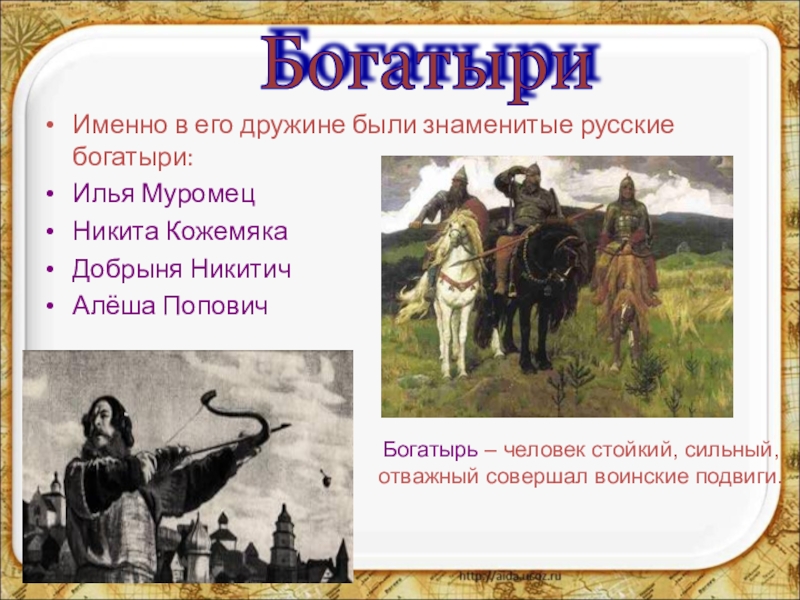 Богатырь – человек стойкий, сильный, отважный совершал воинские подвиги.