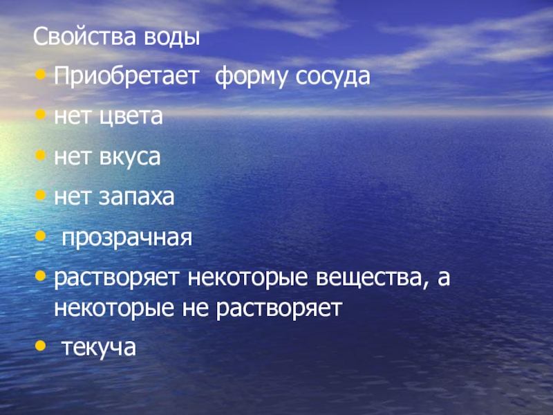 Свойства водыПриобретает форму сосуда нет цвета нет вкусанет запаха прозрачнаярастворяет некоторые вещества, а некоторые не растворяет текуча