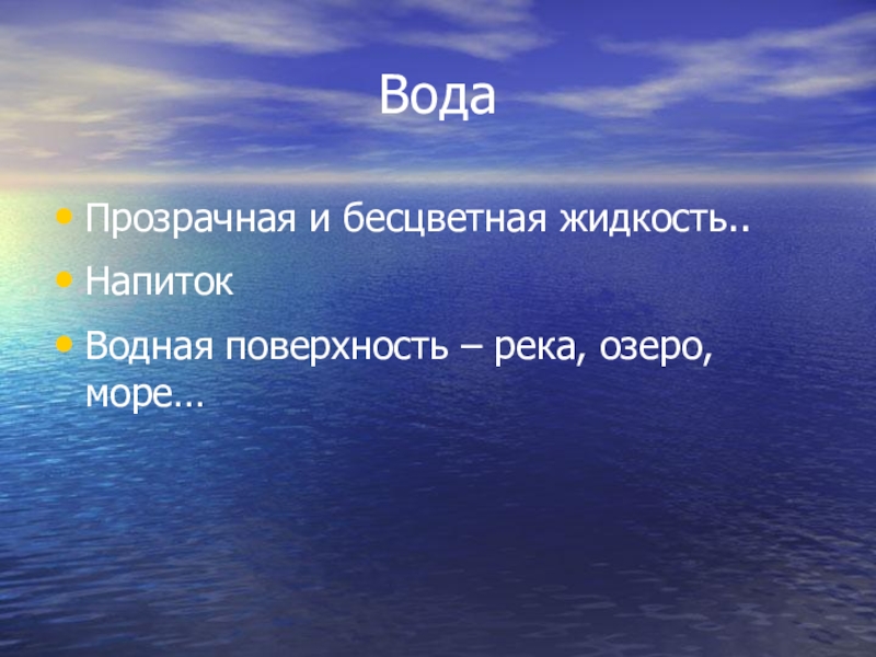 ВодаПрозрачная и бесцветная жидкость..НапитокВодная поверхность – река, озеро, море…