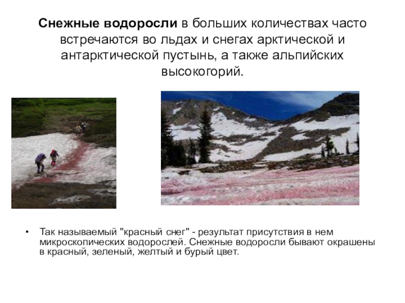 Так называемый "красный снег" - результат присутствия в нем микроскопических водорослей. Снежные водоросли бывают окрашены в красный, зеленый, желтый и бурый цвет.