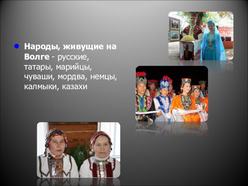 Народы, живущие на Волге - русские, татары, марийцы, чуваши, мордва, немцы, калмыки, казахи