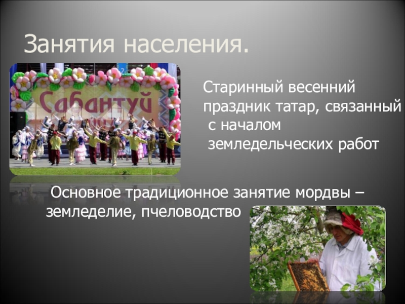 Занятия населения.Старинный весеннийпраздник татар, связанный с началом земледельческих работ Основное традиционное занятие мордвы –земледелие, пчеловодство