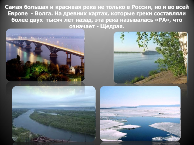 Самая большая и красивая река не только в России, но и во всей Европе - Волга. На древних картах, которые греки составляли более двух тысяч лет назад, эта река называлась «РА», что означает - Щедрая.