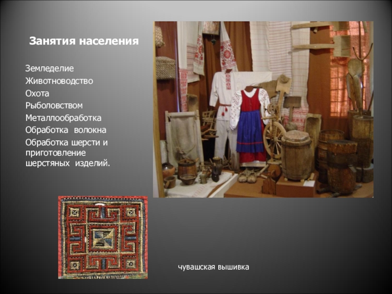 Занятия населенияЗемледелиеЖивотноводствоОхотаРыболовствомМеталлообработкаОбработка волокнаОбработка шерсти и приготовление шерстяных изделий.чувашская вышивка