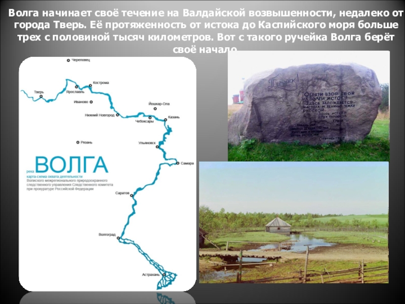 Волга начинает своё течение на Валдайской возвышенности, недалеко от города Тверь. Её протяженность от истока до Каспийского