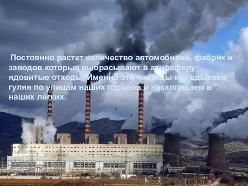 Постоянно растет количество автомобилей, фабрик и заводов которые выбрасывают в атмосферу ядовитые отходы. Именно эти частицы мы вдыхаем гуляя по улицам наших городов и накапливаем в наших лёгких.