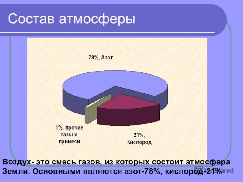 Воздух- это смесь газов, из которых состоит атмосфера Земли. Основными являются азот-78%, кислород-21%