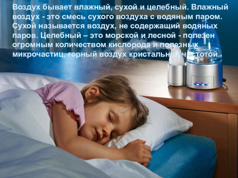 Воздух бывает влажный, сухой и целебный. Влажный воздух - это смесь сухого воздуха с водяным паром. Сухой называется воздух, не содержащий водяных паров. Целебный – это морской и лесной - полезен огромным количеством кислорода и полезных микрочастиц, горный воздух кристальной чистотой.