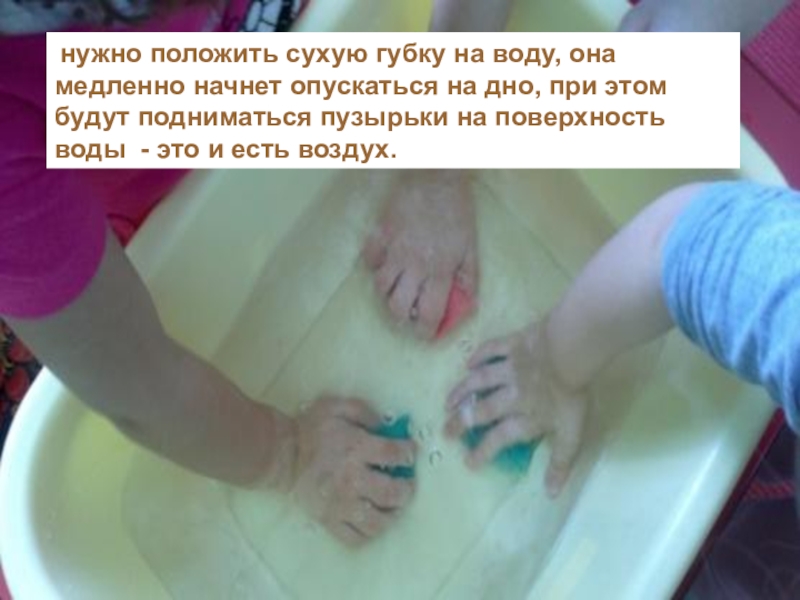 нужно положить сухую губку на воду, она медленно начнет опускаться на дно, при этом будут подниматься пузырьки на поверхность воды - это и есть воздух.
