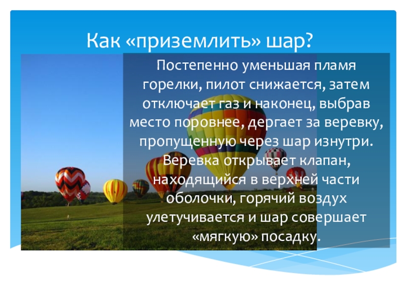 Как «приземлить» шар?Постепенно уменьшая пламя горелки, пилот снижается, затем отключает газ и наконец, выбрав место поровнее, дергает