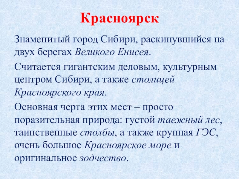 гигантским деловым, культурным центром Сибири, а также столицей Красноярского края.