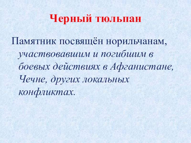 Памятник посвящён норильчанам, участвовавшим и погибшим в боевых действиях в