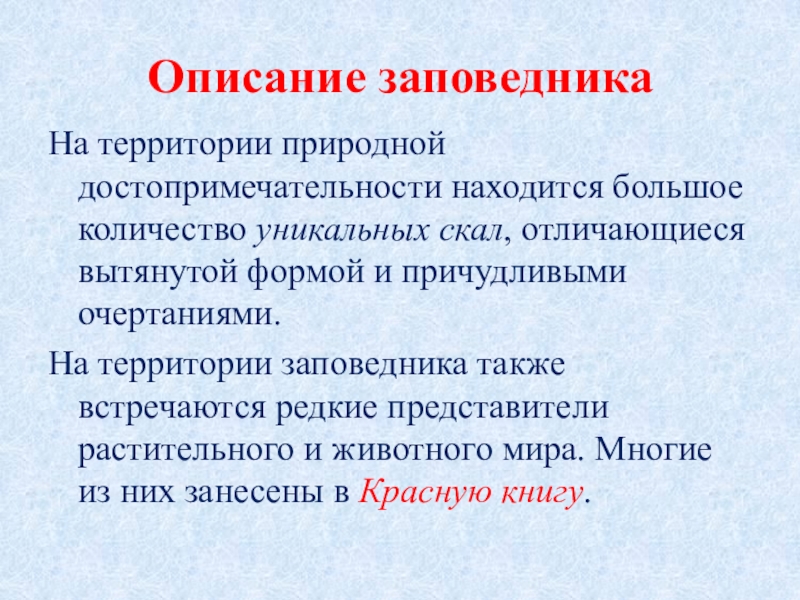 Слайд 20На территории природной достопримечательности находится большое количество уникальных скал, отличающиеся вытянутой