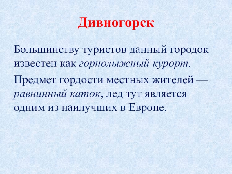жителей — равнинный каток, лед тут является одним из наилучших в Европе.