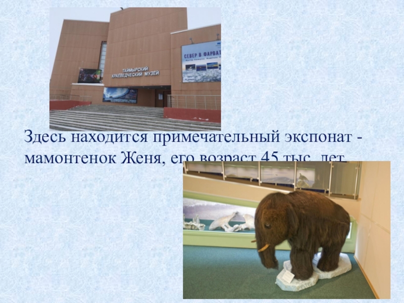 Слайд 30Здесь находится примечательный экспонат - мамонтенок Женя, его возраст 45 тыс.