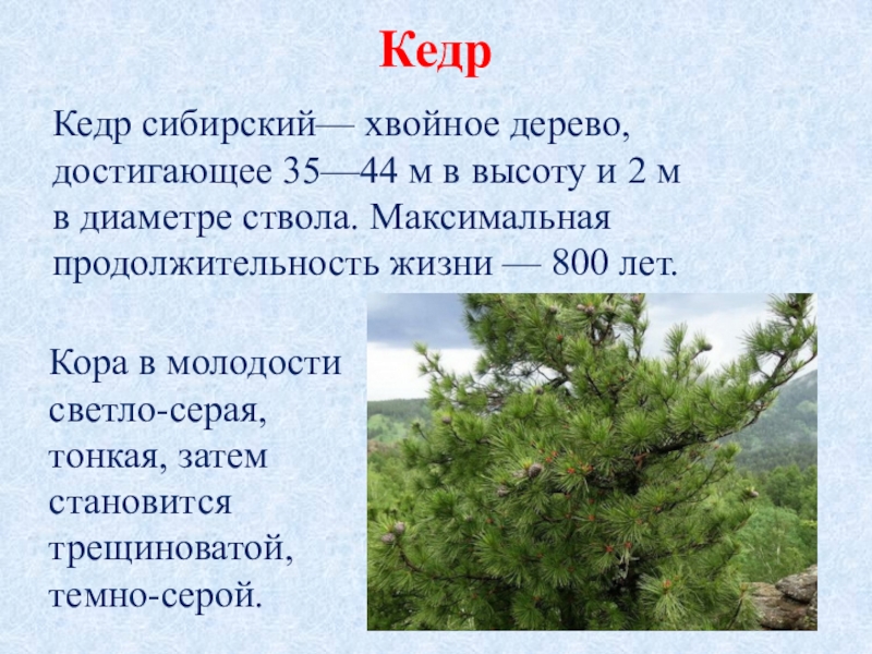 Кедр сибирский— хвойное дерево, достигающее 35—44 м в высоту и 2 м в диаметре ствола. Максимальная